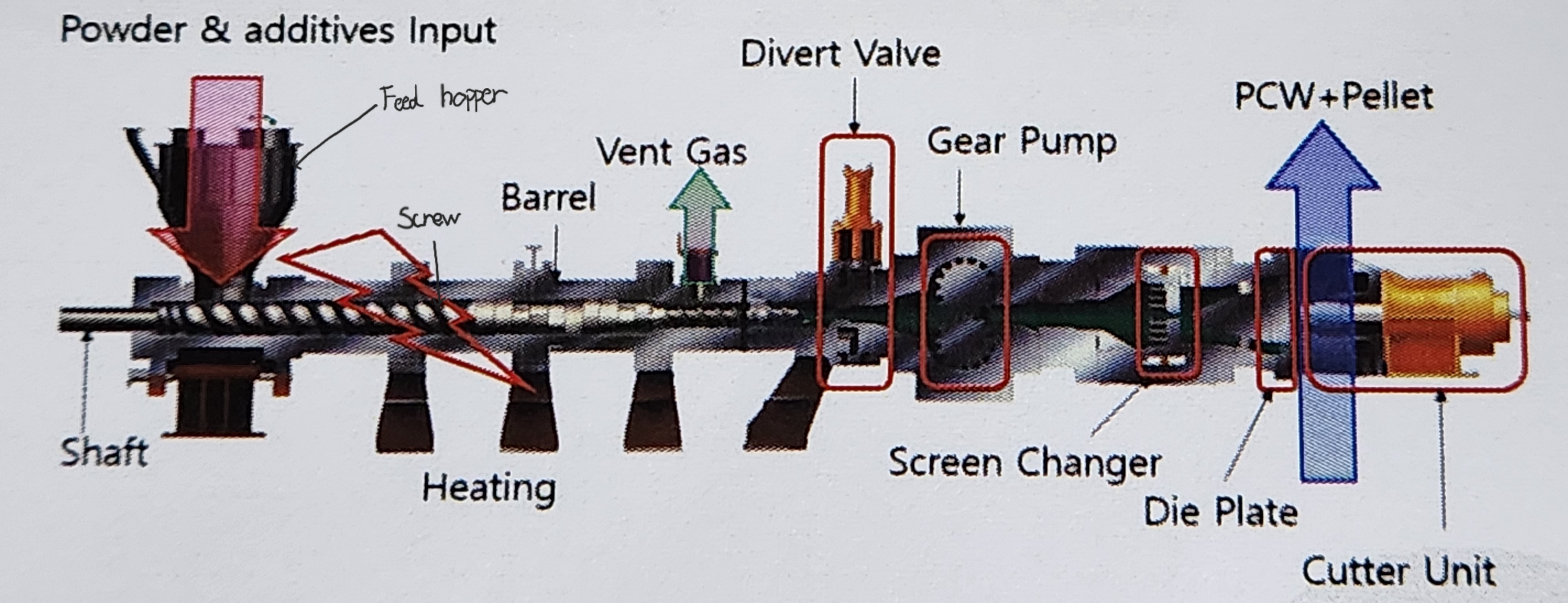 압출기란 Plastic의 원하는 모양으로 성형해 사출하는 설비다. 즉, Plastic은 고온에 용융된다는 성질을 이용해 원하는 모양으로 제품을 토출해주는 설비이다. Pellet (쌀 알갱이 형태) 혹은 Powder (분말) 형태의 플라스틱에 열을 가하여 용융시킨 후 그것에 형상을 부여하고 냉각하여 고형화시키는게 해당 설비의 목적이다.
